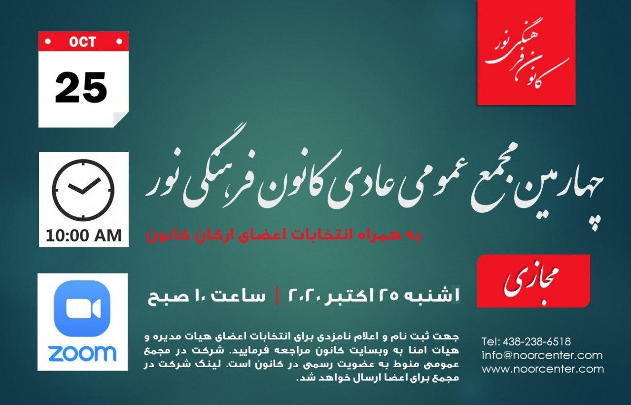 چهارمین مجمع عمومی فوق العاده کانون فرهنگی نور بمنظور بررسی پیشنهادات اصلاح اساسنامه در روز یکشنبه ۲۵ اکتبر از ساعت ۱۰:۰۰ صبح بصورت مجازی (آنلاین) برگزار میشود. برنامه مجمع فوق العاده به شرح زیر میباشد: