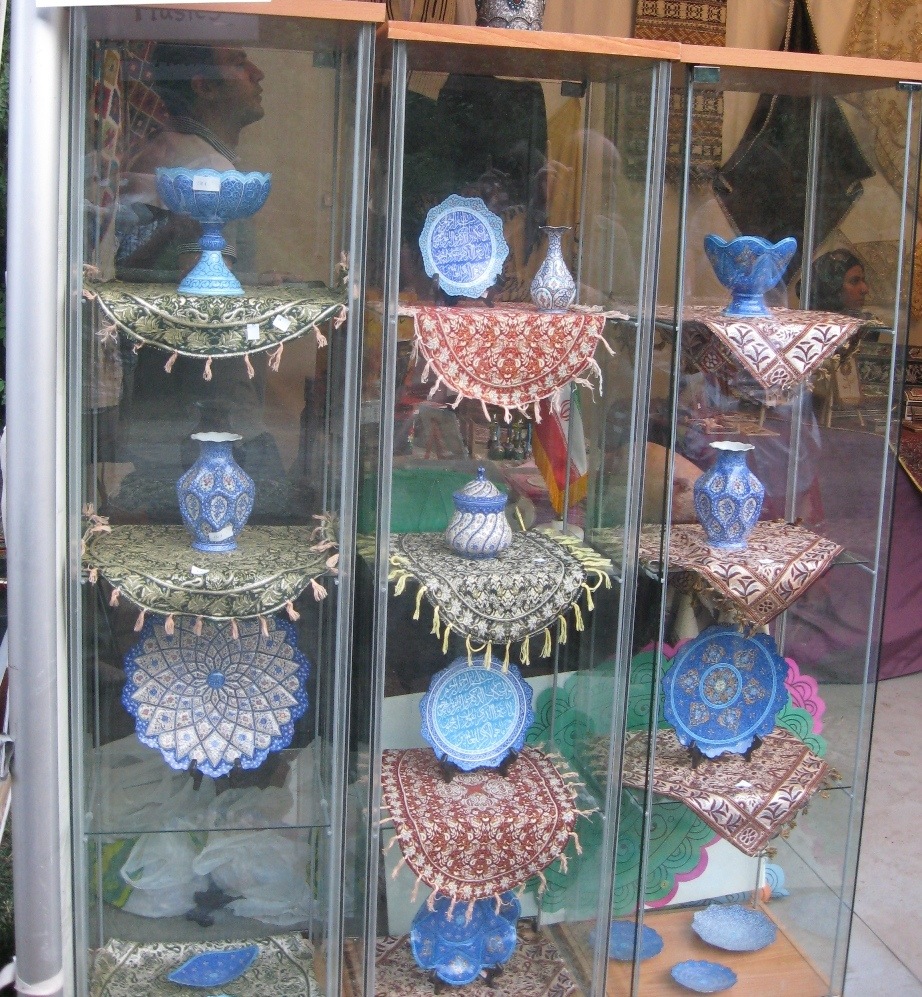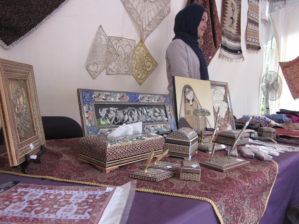 همچنین انواع قطعات خاتم کاری، ترمه، رومیزی های قلمکار، شال و روسری های منقش، قطعات معرق، تعدادی گلیم و لباس های محلی و نیز جواهرآلات سنتی در این غرفه در معرض نمایش گذاشته شده بود. تعدادی پوستر از جاذبه های توریستی ایران نیز در دیواره های بیرونی غرفه نصب شده بود. گرچه زیبایی و ظرافت اقلام صنایع دستی عامل اصلی جلب توجه گسترده بازدیدکنندگان بود، ولی آنان به ندرت برای خرید اقلام صنایع دستی اقدام می نمودند که علت آن را می توان درقیمت بالای اغلب صنایع دستی موجود در غرفه مانند ظروف میناکاری یا قطعات خاتم جستجو کرد.